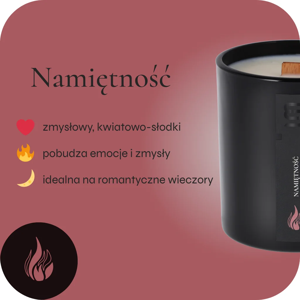 Świeca „Namiętność” to zapach, który budzi zmysły i wywołuje dreszcz emocji. Wyobraź sobie aromat dojrzałej, soczystej brzoskwini, której słodycz przenika się z aksamitną wanilią. Bukiet kwiatów – jaśmin, róża i biała lilia – nadaje zapachowi elegancji i tajemniczości, jak romantyczny wieczór w świetle księżyca. Głębia ambry i paczuli podkreśla zmysłowość, a irys dodaje odrobinę wyrafinowania.
